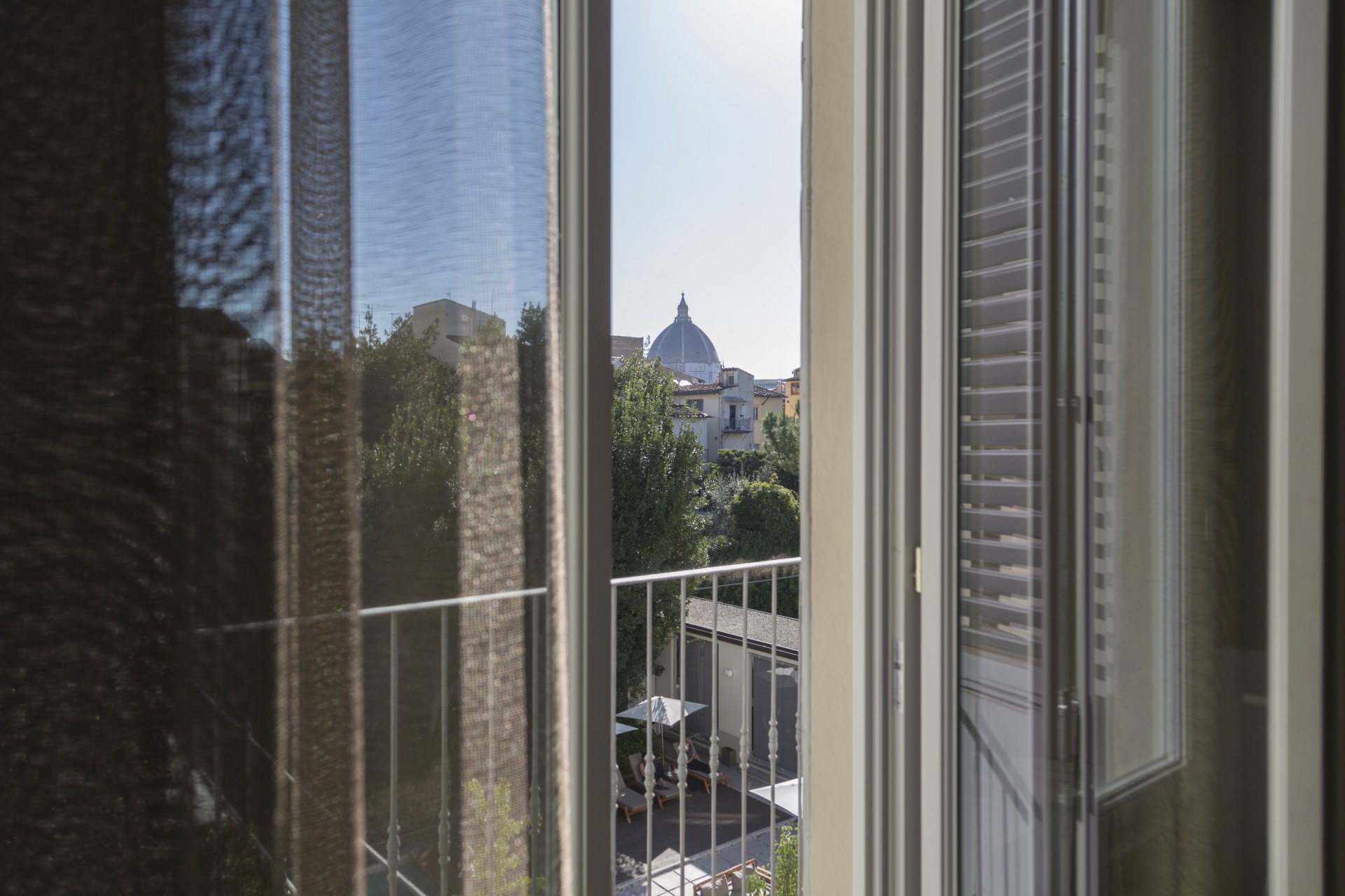 Overlooking Piazza Indipendenza, the Junior Suite has a luxury bathroom with a marble console, and comprises two rooms with a double entrance. The Junior Suite with a View has a spacious bathroom with a luxury marble console. Guests will love the panoramic view over our magnificent private garden, offering them a dream stay immersed in nature just a few steps from the most important symbols of Florence, such as the Cathedral of Santa Maria del Fiore and Giotto’s Bell Tower. From the upper floors Brunelleschi’s dome stands out proudly against the Florentine sky.